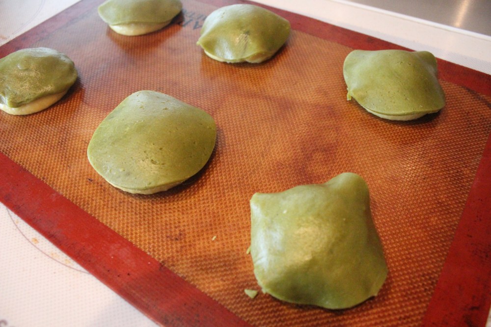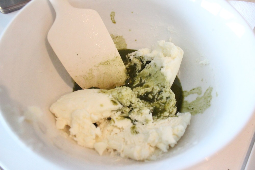 Whip together butter, matcha, and sugar. Fold in the flour. Mix into a dough ball. Refrigerate. Lightly dust a surface with flour and roll out the dough to 1/8th an inch. Cut out 2 inch circles, and freeze until solid.