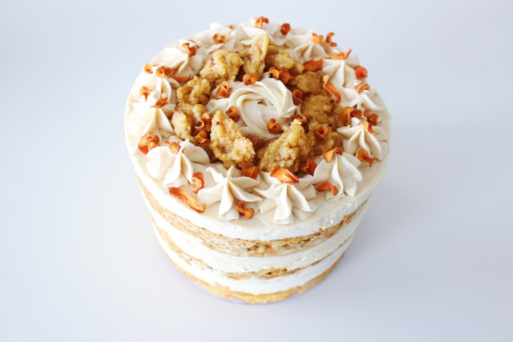 Place a 6-inch ring mold onto a lined sheet tray. Line with your acetate. Start with one of the two perfect or full rounds of the cake first. If there are any gaps between the cake and the ring mold, press in any cake scraps to fill those holes – this will prevent the fillings from leaking out of the bottom. Pour 1/3 of your soaking liquid onto the cake, then spread about 1/4 of your cream cheese frosting on top. Place a handful of the crunch down then pour on 1/2 of your ricotta cheesecake mixture. Place in the scrappy layer of cake, using more scraps and pieces to fill any gaps. Add in another 1/3 of the soak onto that layer, then repeat the other steps. With your last layer, place it down, and then soak. Add on the 3rd 4th of your buttercream and use an offset spatula or a butter knife to spread this as evenly as possible. Transfer the last of your buttercream to a piping bag and pipe on the frosting. Place in the freezer for at least 2 hours to allow your fillings to set. Remove the cake from the freezer, and remove the ring mold and acetate, before transferring to a serving plate. Garnish with your crunch and carrot petals.