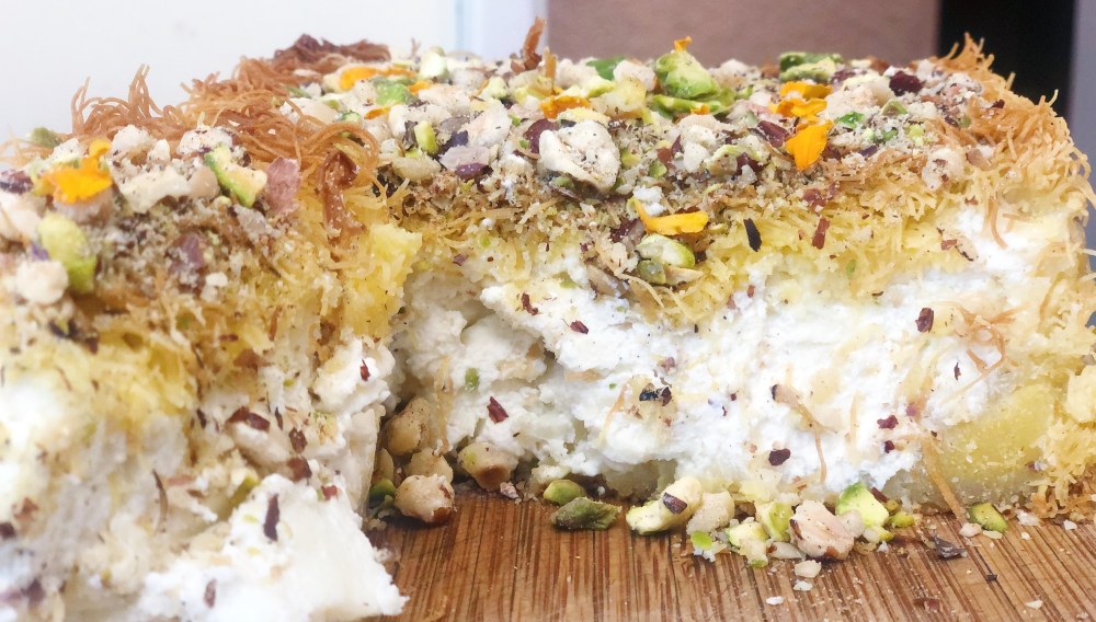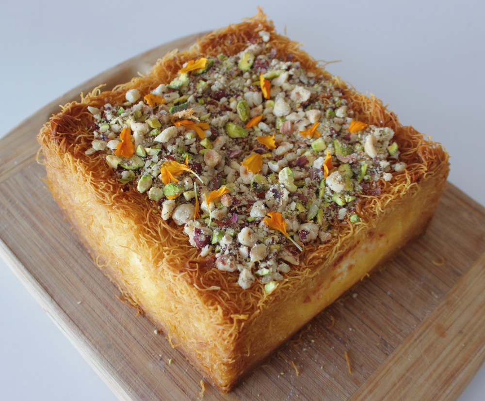 Now I have done knafeh in the past. But I have never had a chance to work with kataifi(shredded phyllo) due to never being able to find it. That is, until my coworker, Desiree, told me about a middle eastern market that was actually really close to where I live! Super special thank you to Desiree, because had she not told me about the market, I would have never had a chance to make knafeh with the better-known dough!