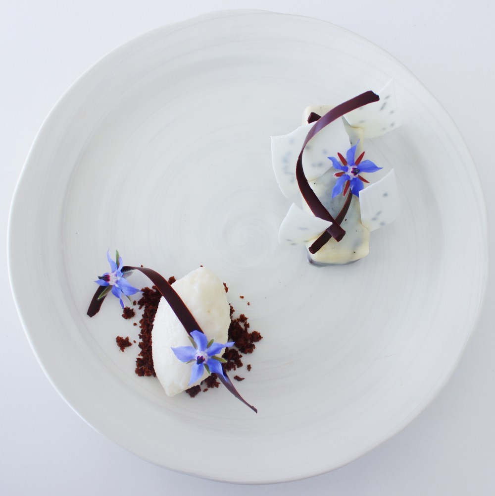 Start with your glazed mousse cake and garnish with the tempered chocolate pieces. Make a small mound of crumble and quenelle on your ice cream. Place the tempered chocolate curls on the quenelle. Garnish both parts of the dish with the borage to finish.