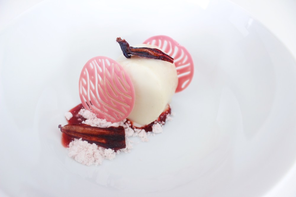 I really wanted to work with custard apple, also called cherimoya, and that’s where the inspiration came from for this dessert. Custard apple, as the name suggests, tastes like a creamy pear or apple. The catch is that it has tons of poisonous seeds in it that need to be removed. Ugh, me with inedible fruit seeds, I swear. But the idea of a semi poisonous apple reminded me of Snow White and how she ate a poisoned apple in the fairy tale, hence the name for the dessert. Playing off of that idea, I went with a ruby chocolate snow as well, and I had a ton of dried hibiscus, which has a more acidic flavor to it, so I opted to use that, since the color will be blood red, and it felt good to not have to rely on citrus this time to get acidity into a dessert! To capture the texture of cherimoya best, I went with a frozen parfait, something I also don’t do that frequently, and paired that with the hibiscus syrup, and disks of ruby chocolate for texture, and some ruby chocolate snow, since it’s Snow White’s apple, and there needs to be snow on the plate of some form. If you want to argue with me that the snow should be white, well it’s dyed pink because she ate a poisonous apple and the snow is now tainted with her blood. There you go. I went there.