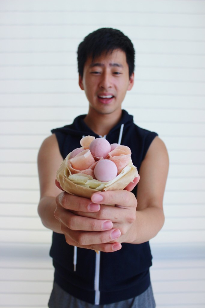 Spread the ganache onto the crepes. For the rosettes, fold them in half and wrap them around each other, starting from one side. Place the rosettes and mousse balls into the larger crepes, which you will roll into cones, to serve.