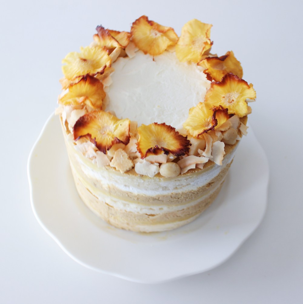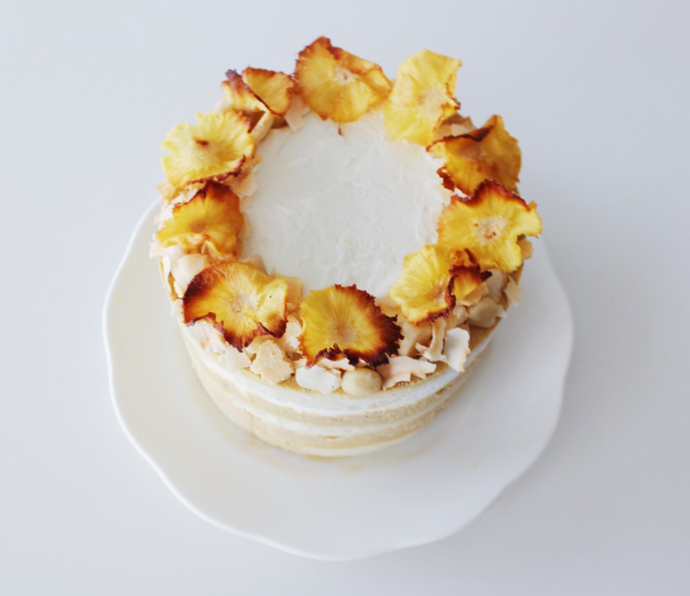 So I made this cake for my friend, Carolyn, specifically on her birthday. She was hardcore craving a “toasty, tropically flavored” cake, and she literally gave me a list of what she wanted. She wanted a coconut cake with crunchy macadamia nuts, something with pineapple, but it had to be cooked, toasted coconut, and something with blonde chocolate to add another crunch. From that, I went with a coconut cake with a pandan-roasted pineapple soak, caramelized pineapple ganache, macadamia nuts, toasted coconut, blonde chocolate or dulcey, coconut cream, and pineapple chip flowers. I really just wanted this cake to be a fun, tropical experience. To really impart coconut flavor into the cake, I went with using some coconut flour in place of the AP flour, since that is just basically finely ground up coconut anyways. The end result? A fluffy coconut cake with layers of tart and sweet pineapple ganache, sweet coconut cream, and a lot of crunchy bits. I wanted this coconut cake to be more Southern-styled, since my friend requested that specifically, so I went with the technique of alternating between adding your dry and wet ingredients to creamed butter and sugar – normally, I would just dump everything in together, but the alternating techniques gives your cake more structure because more gluten is being developed and air is being incorporated into the cake, giving it that fluffy and toothsome mouthfeel.