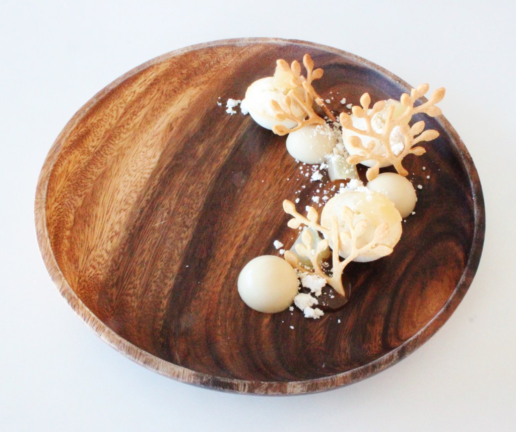 For the dessert, we are highlighting the baobab fruit, alongside cardamom and almond. I went with those flavors since I figured that baobab being similar to a citrus would pair well with them. I used Valrhona’s Almond Inspiration chocolate for this dessert, since that guarantees natural almond flavoring in a baobab-almond cremeaux(set custard-like ganache). I also am making cardamom financier(brown butter-almond sponge cakes), just to anchor down the dessert with a body or a focus. With those, we have baobab gelee, baobab dust, cardamom-almond butterscotch, and baobab-cardamom tuiles to round out the dish. For my tuiles, I went with baking molds from Pavoni, specifically their Bonsai shaped molds, but if you do not own or want to buy those, just use a piping bag and parchment or a silpat instead! Or just get creative and make your own tuile shapes! Overall, the dessert has a festive feel to it, but it also embraces flavors and techniques popular in both modern Europe and Africa, which I find to be a fun way to highlight this fruit from Zimbabwe.