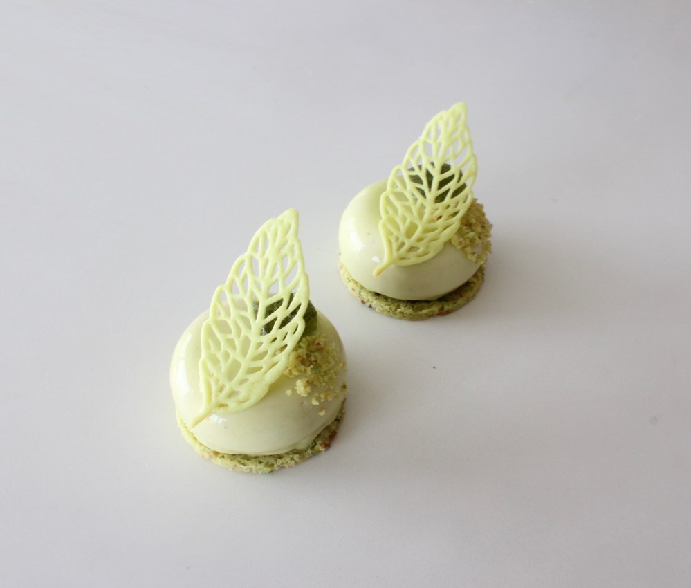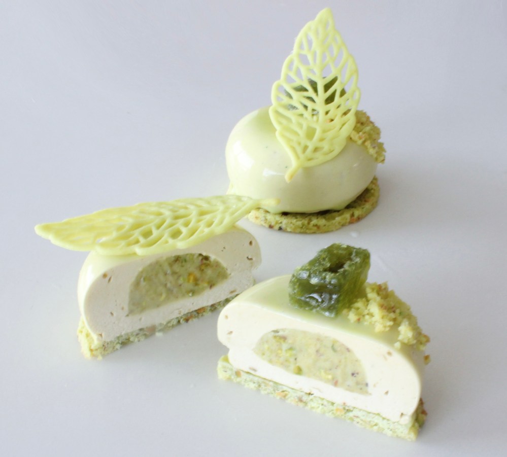 For the components, we have a pistachio namelaka(rich chocolate ganache that is whipped) as a core to a chrystanthemum mousse, a pandan glaze, pandan-pistachio shortbread, pistachio crunch, chrysanthemum and pandan kohakutou(Japanese rock candy), and pandan tuiles in the shape of a feather. I love how the green color of the pandan comes through nicely, while the pistachio being a vibrant green as well compliments that color. I really wanted this petit gateau to have that “woodland fairy” aesthetic to it, while the name references Jade, being a valuable stone in China, and fairies, which exist more in European culture, since I am using European techniques and pistachios being a more Western ingredient.