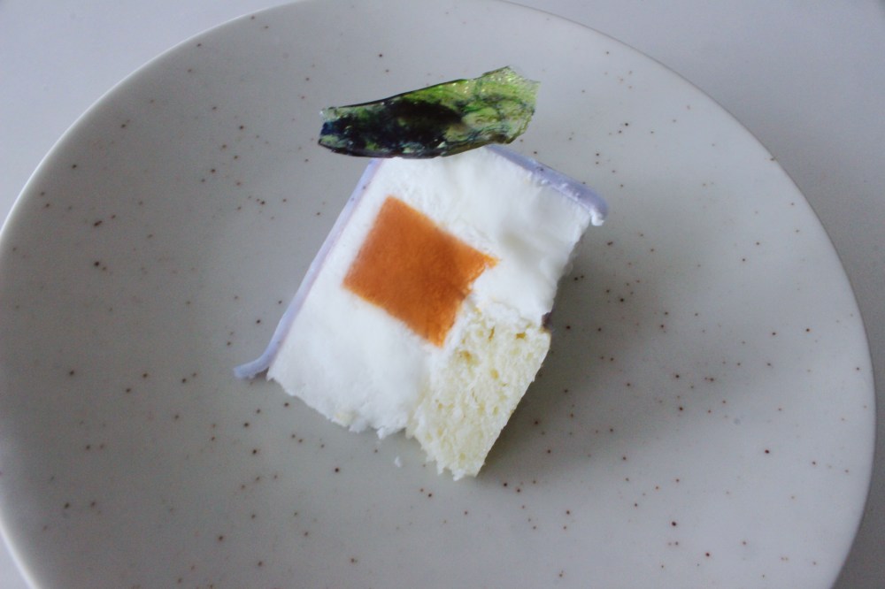 Mix the gelatin with water. Place the gelatin, milk, sugar, and salt into a pot and bring to a simmer. Once the gelatin is fully dissolved into the milk, pour the liquid into the skyr and whisk it with the vanilla as well. Fold into that the cream. Line a 6-inch ring mold with oil and place onto a cling wrap-lined surface. Pour in about half of your mousse first. Press into that the ring of sea buckthorn gelee. Then pour in the rest of the mousse. Press into that the round of cake. Then freeze the cake for at least 4 hours before attempting to unmold.