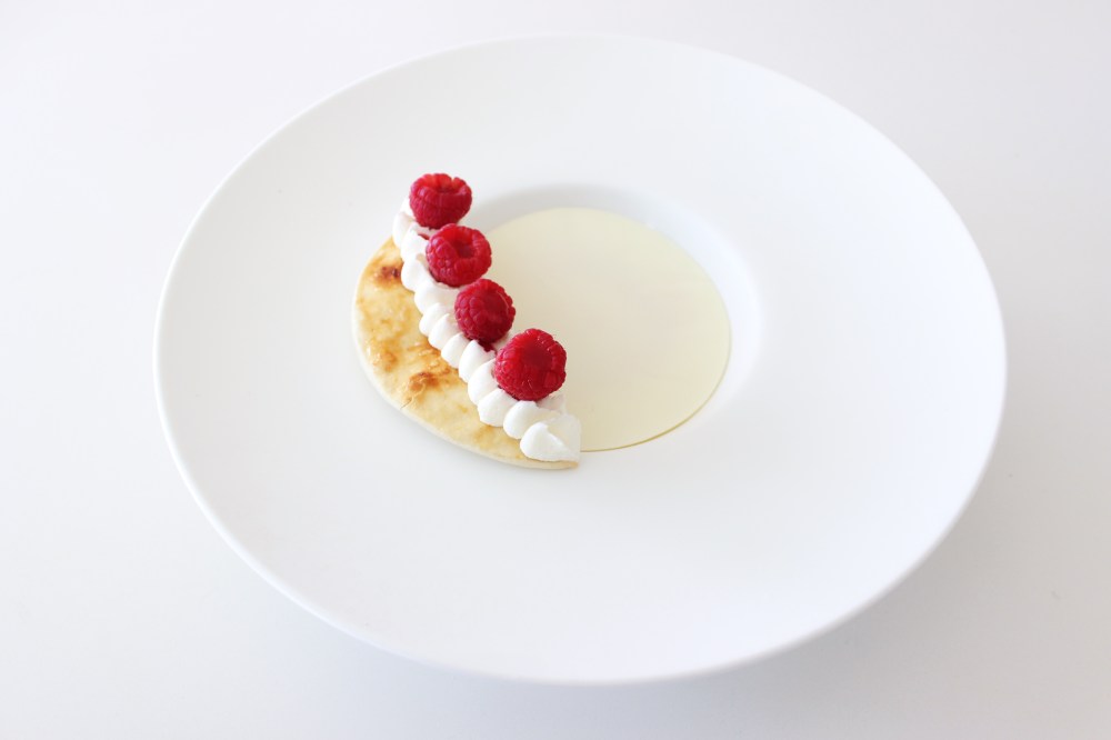 Start with piping the cream onto the cooled down phyllo. Pipe the reserved coulis into the cavities of the raspberries and place those onto the cream. Place the disk of white chocolate onto the bowl, and then finish with the phyllo crisp on the side to serve.