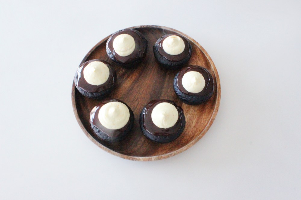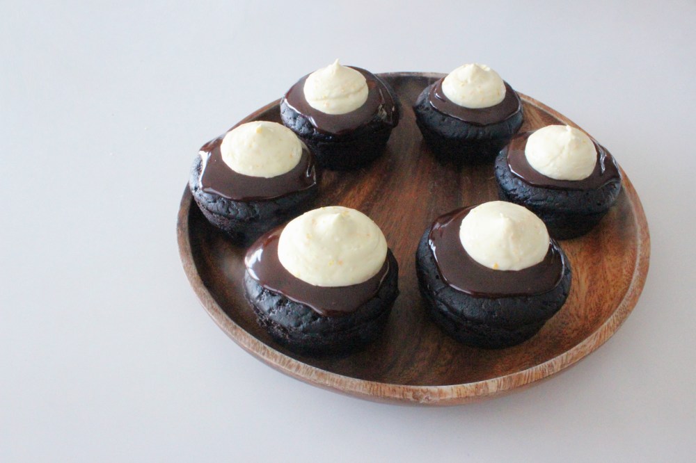 These were kind of my ode to a Hostess cupcake. A dark chocolate cake with a cream inside and ganache on top. Fudgy, delicious, and definitely a guilty pleasure of mine. For this rendition, I went with a chocolate cake that uses black cacao, which has this almost fruity quality to it from being an alkalized version of normal cocoa powder. Coffee and regular cocoa powder are mixed in as well, just to round out the flavors and give it a nice hit of chocolate. The filling, instead of the standard cream, I went with an orange cheesecake, since I love black bottom cheesecake, and this is my way of combining that with a Hostess snack cake to get a two in one deal! An orange and chocolate ganache finishes off the dessert as well. This recipe would be easily adapted to be vegan if you just sub out the cream cheese with a vegan cream cheese, and the lack of eggs or butter makes you feel a touch less guilty about your life decisions on eating all six of these in one go like how I did.