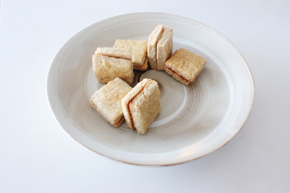 I feel like every Asian household has that metal tin of cookies in it. At least every household that that I’ve been to. One of my favorites were this cookie sandwiches that would usually feature some kind of cream in them. So that’s what these sandwiches were meant to be an homage to. I went with turbinado (a courser cane sugar that has a pleasantly earthy texture and a nice crunch) shortbreads for the cookie, since I wanted there to be a nice level of sugar in the dough. For the filling, I did a burnt tahini ganache. The burnt tahini came from me trying to experiment with tahini paste the same way I did with miso. The result? A smoky, pleasantly nutty finish that worked well in a ganache. So that’s literally it for this recipe. Cookies and a filling.