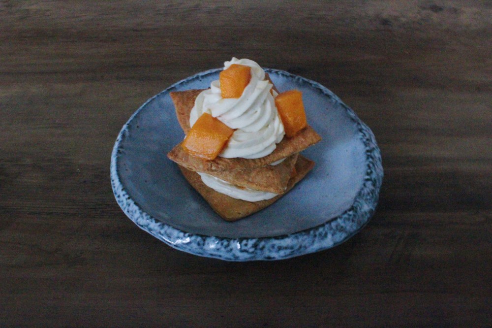 So with this dessert, I wanted to combine Indian flavors with Albanian and French techniques. For the pastry, I went with a homemade phyllo, brushed with ghee just to guarantee that beautiful browning on the dough. With the filling, I did a yogurt and cardamom namelaka, which is a ganache that is whipped. For this case, I went with white chocolate, since I wanted the yogurt and cardamom to not be overpowered by dark chocolate. I also used yuzu-compressed mango to add more tartness and acidity, as well as some freshness to the dessert. This dessert could be called a mille feuille in that it features many layers, but you can also refer to it as a galaktoboureko or a krempita for its usage of the phyllo dough instead of traditional puff pastry. Regardless of what you call it, it will taste of mango lassi, but with crunchy pastry between each and every bite!