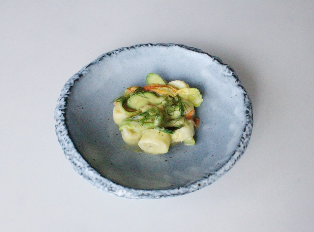 Blanch and shock the zucchini and blossoms. Sauté the fennel in olive oil until soft. Season. Toss into the pan with the fennel your boiled gnocchi and stir until the fennel is mixed throughout. Pour into a bowl, toss with the sliced zucchini and the blossoms. Then mix in your sauce to finish. Since it’s a fresh sauce, you don’t want to heat it up too much or it’ll turn brown! To plate, simply place the gnocchi into a bowl and garnish with the fennel fronds to finish.