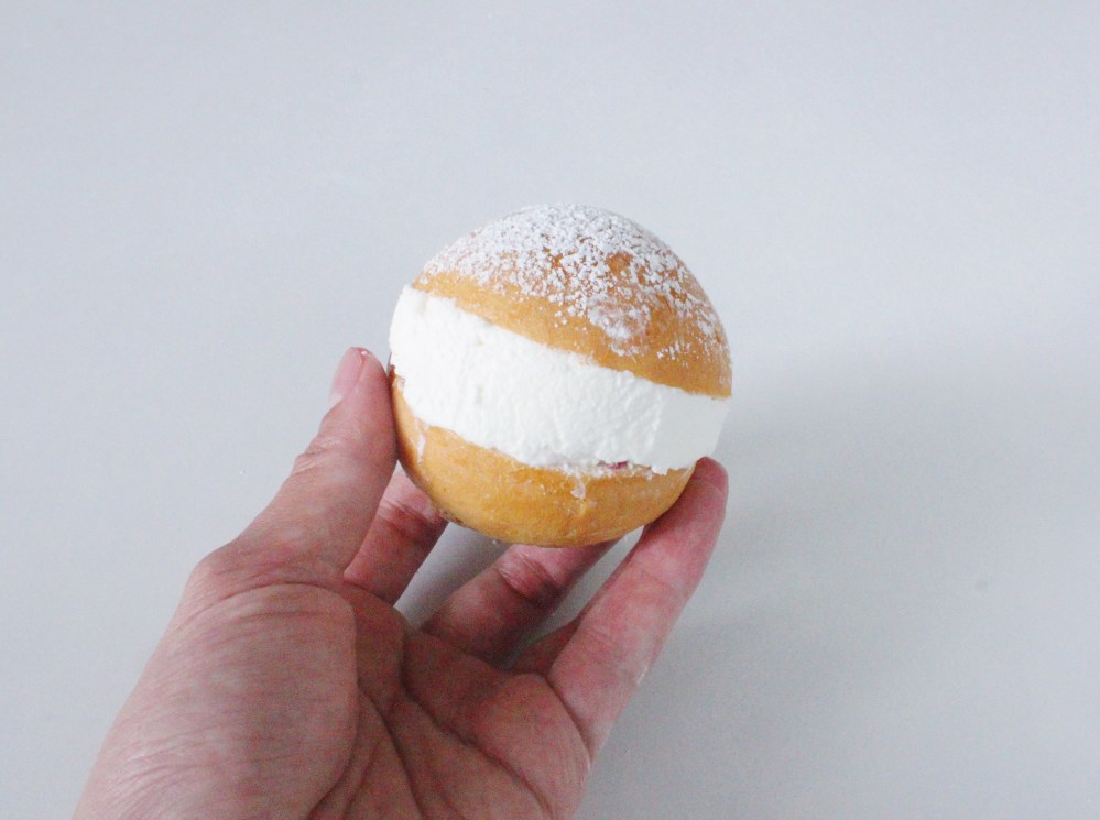 Cut the cooled down buns hamburger style about 90% of the way through(you still want the bun to be a single piece of bread). Spoon earl grey tea inside of the buns. Or dunk the buns into the tea(I opted to spoon just because dunking could get really messy). Spoon in jam and cream into the buns, and smooth them out with an offset spatula. Dust with confectioner’s sugar and serve immediately!
