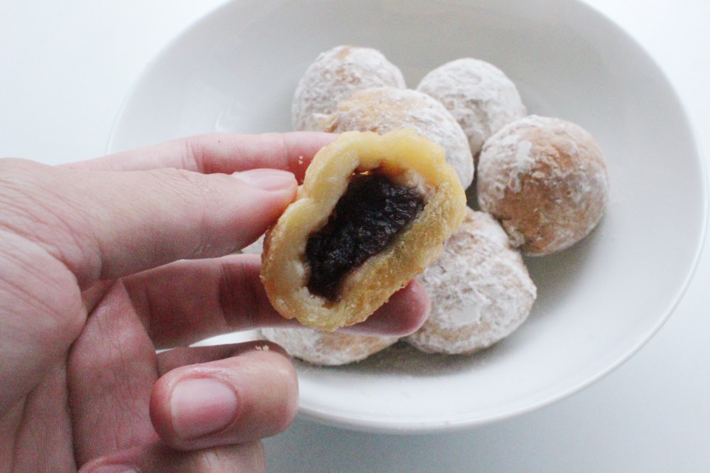 It’s important to make sure that you freeze the red bean filling beforehand, as red bean paste is super soft, and you’ll wind up with it squeezing out of the sides if you tried to just pipe it straight into the dough. It’s important to keep the filling completely surrounded, or it will burn in the fryer. Other things to keep in mind are the frying times – unlike most doughs, you don’t want to fry this one until completely golden brown. Mochi has a tendency to puff up a lot, and with a paste-type of filling, that could cause a giant mess. You literally just want to fry the dough until it becomes blonde, since the dough is vegan, and is made of half already-cooked mochi, you don’t need to fry it for long for it to be fully cooked. The usage of miso paste in the dough replaces the egg, but it also helps keep the dough from puffing up too much. I took a similar approach to making boba with using half cooked and half uncooked starch so that your doughnuts can hold together, but will not come out tasting dense. The end result is a crispy, crunchy doughnut dough with a nutty and smoky sugar, and a sweet bean filling.
