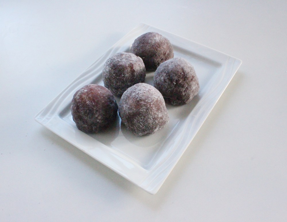 Mix shiratamako, acai, salt, and water together first. Steam for 20 minutes. Pour the steamed dough into a nonstick pan and heat up with sugar. If the sugar crystalizes, pour in some water and continue to stir until everything is smooth and glossy. Pour onto a potato-starch-lined sheet tray and divide into 6 pieces. Allow each piece to cool slightly before wrapping around the frozen mousses.