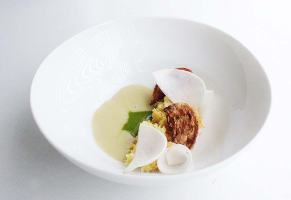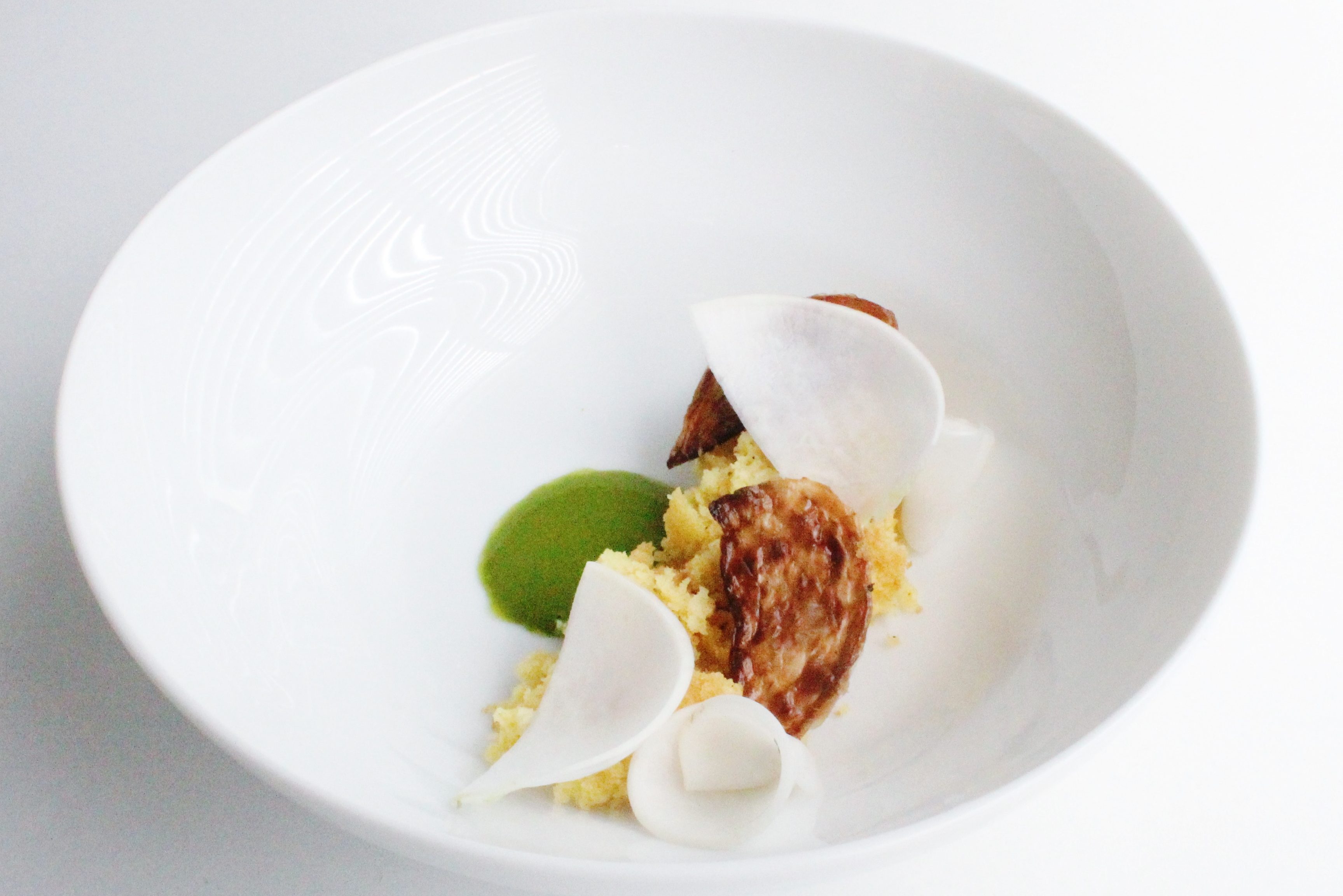 Whenever the summer rolls around, cornbread is just one of those things I always love to make! For this recipe, I went the vegan route, and made a cornbread that uses miso paste and a corn dashi, as well as a vegan coconut buttermilk, just to create a super fluffy texture and a moister crumb. I served the cornbread with more of that chilled corn dashi, since I love the creamy texture of it, and how well it pairs with the cornbread in both flavor and keeping the cornbread from being too dry. However, I could not just leave the dish at that, as it would be too simple and honestly, kind of naked. So while I was wandering the Japanese supermarket, I stumbled upon these really pretty turnips with the greens attached. Originally, I had the idea of just using the turnip itself as a pickle and as shaved petals. But then I got the idea to also do roasted turnips, since that would add a nice meatiness to the dish that it was missing. And with the greens, I was going to use them in another dish altogether, but then I opted to make it into a green emulsion to add grassy and bright notes to the dish to contrast the creamy corn dashi a little more. Overall, it was a fun dish to make, a fun dish to eat, and it embodies summers in Asia and American, in my humble opinion.