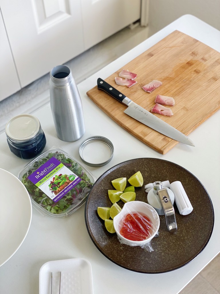 Out of the five dishes I served at my “Namie” pop-up for 4Foodie, I would say that this one was the one I was most excited about. I never actually tried to do a sashimi dish before, at least without the help of somebody else slicing the fish for me. However, in this case, I actually sliced it myself and everything(with a lot of carefulness as to not make the pieces too large, clunky, or ugly). When it comes to sashimi, you want thin slices so that the fish almost melts in your mouth, so I was definitely aiming for that. For the actual dish, I went with a hamachi that I marinated in a stock made from butterfly pea and kombu, as well as rice koji. Rice koji converts the salt that is added into the marinade into amino acids, which in turn, imparts even more umami into the hamachi, and giving it a meatier texture as well. With the butterfly pea stock, it was split into being a marinade for the hamachi, but also infused with lemongrass and soy lecithin to form a foam that resembles the ocean waves. I paired that with some Thai chilies, microherbs, and limes to round out the experience, as the chilies add a needed heat to an otherwise flat dish, and the lime added the acidity, but also gives the dish a cool color-changing effect as the lime juice dissipates the foam, and reduces it into a pretty purple broth that is then soaked into your hamachi!