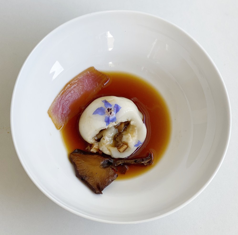 With this dish, you have a rich mushroom dashi, a chewy dango stuffed with a miso-mushroom ragout, an oyster mushroom that has been dehydrated so that it is both crunchy and almost like a mushroom jerky in texture, and a poached onion petal to resemble a clamshell. It is 100% vegan, umami-forward, and just a fun dish to make either for a dinner party setting, or for family and friends at home! One of my favorite parts about eating this dish is cutting into the dango and seeing the mushroom ragout inside of it, just because it almost resembles the fish balls that you would see in shabu shabu that have cod roe inside of it! It’s definitely a fun, plant/fungi-based take on an Asian classic, while also being a subtle nod to both a pasta and soup course in a progressive menu tasting.