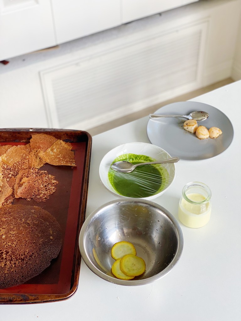For the components themselves, I made a stock using the scallop’s abductor muscles(this little nub on the side of the scallop that turns rubbery when you cook it), with kombu and water. That base stock was used for the lace tuiles, just to impart a scallop-y flavor into them – lace tuiles themselves are very Chinese, as we usually use them for things like potstickers! They also resemble coral, which is what I was going for on a visual standpoint. The other components are the preparations of squash, seared scallops, and nasturtiums, which are both a lily pad-like leaf and a bright orange-red flower, both of which have a pleasant pepperiness to them, to contrast the lemon throughout the dish! Overall, it was a fun dish to make, and it does embrace the immediacy in cooking, as this is a dish that needs to be eaten as soon as it’s plated, or the tuiles go soft quickly.