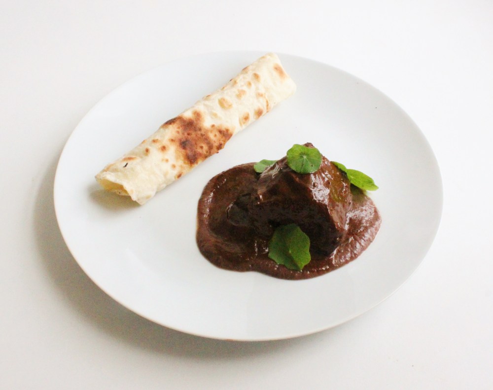 This was one of those dishes that I had on my to-make list for months, but I just never got around to it, mostly out of laziness – I wanted to practice doing a Oaxacan style black mole, using black garlic, but I just never got around to buying the chilies for it until more recently. For this dish, I wanted something that was dark in color, and I knew black mole with black garlic would fit that bill perfect. Pairing it with black beans and a tortilla is an homage to a tlayuda, which is like a Oaxacan pizza made from a tortilla topped with bean puree and other things. I took that and sort of flipped it on its head, having the bean puree, or in this case, a black bean crema, as the base for a black mole-braised shortrib, with the tortilla on the side. I named this dish “Nigredo”, because that is a term in alchemy for “deterioration”, which, between the mole oxidizing into the color black, using black garlic which is a fermented product, and featuring a braised protein, fits that bill perfect. That and “Nigredo” prefers to the term “blackness” in Latin, and with a black mole, that description fits nicely there as well. Overall, this dish is very earthy and comforting, with the mole having these rich, molasses-y notes from using the black garlic in particular.