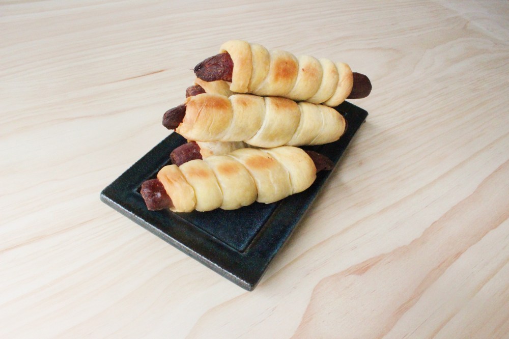 Divide the dough into 12 pieces. Roll each piece out into a log that is about 1/8-inch in diameter, and wrap around a lapseng sausage. Proof at room temperature, covered, for another hour. Then bake at 375 degrees F for 25 minutes.