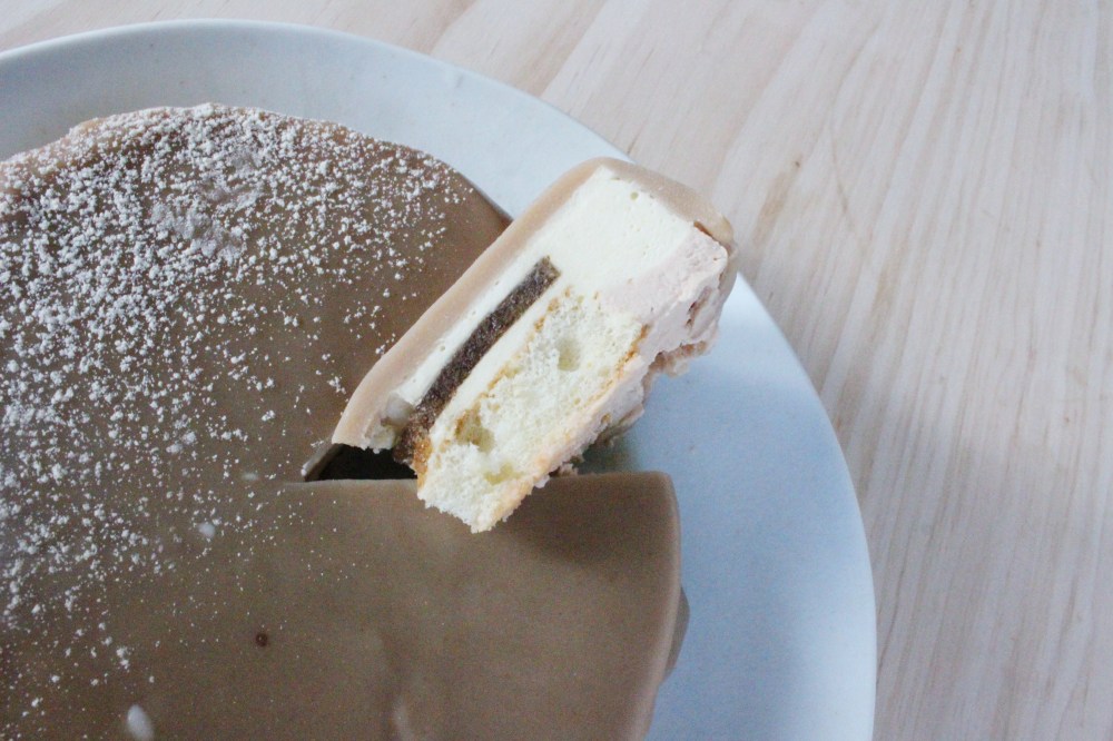 For the components, we have an injeolmi chiffon cake, a barley tea gelee, injeolmi mousse, Almond Inspiration mousse, a barley tea glaze, and a light dusting of injeolmi to half-cover up any flaws in the cake and to half tie back in with the fact that injeolmi is used to coat rice cakes in Korean cuisine traditionally. It was a convenient coincidence, because it just finishes off the cake nicely, and makes it almost look like snow on top of the mirror glaze! I made two of these cakes, since I wanted to take a cross section picture, but I scaled the below recipe down to be just one cake, in case anyone thinks that I’m a monster who would feed a pregnant woman caffeine or cut into a cake that was meant to be a gift – I am not. Well, a person who would do those things anyways. A monster? Maybe.