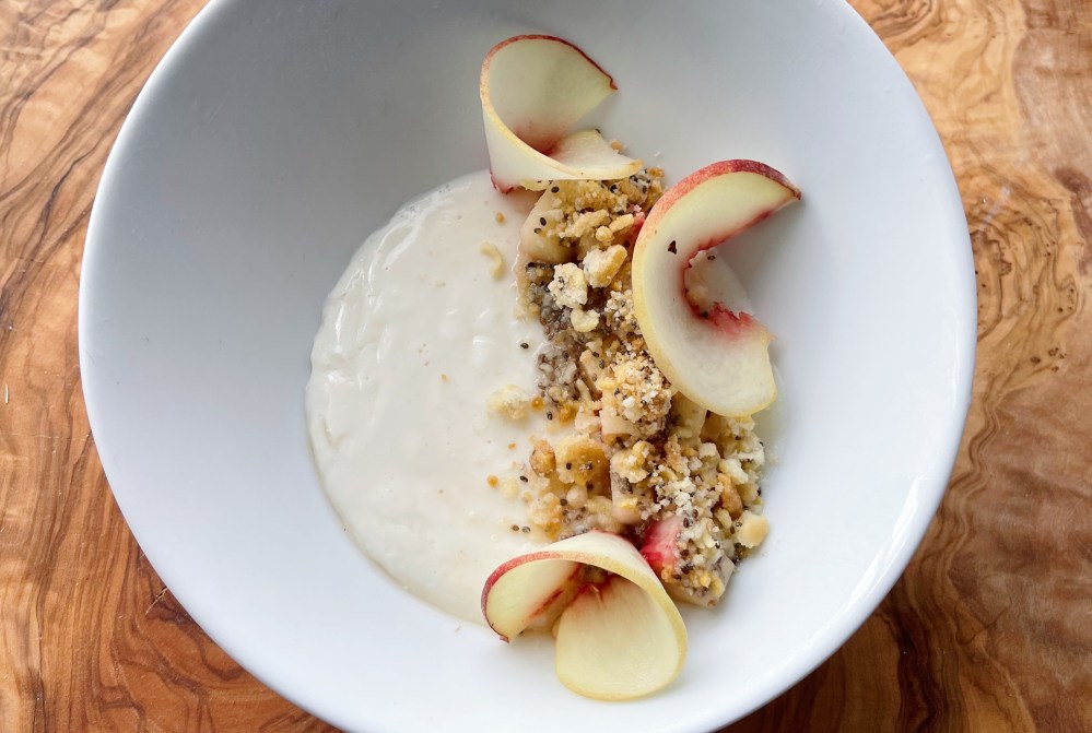 Layer on top of the panna cotta your macerated peach cubes, then the chia seeds, your crunch, and finally, the shaved peach pieces.
