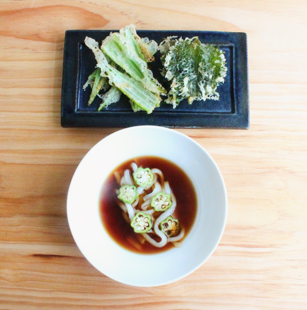 This dish came about because my friend Karen was growing okra in her backyard, and she gifted me with a ton of it when I hung out with her. My initial thoughts on what to do with the okra were either a curry or a gumbo, but then I thought about something lighter and more refreshing. Since okra is basically just slime with a slight bitterness, I knew that I could use that slime to my advantage. A lot of Asian cuisines treasure slimy and gelatinous textures, so I knew by going with a more Japanese-Chinese approach with the okra, it could be potentially really tasty! I went with Chinese-style potato noodles, using the okra slime to help bind them together – potato noodles on their own are 100% gluten free and have this lovely chew to them, while the okra slime is acting as another gluten substitute just to keep the dough from falling apart. I also used that okra slime to fortify a chilled dashi, giving it this luxuriousness and unctuousness that it would otherwise lack. To finish the dish off with, some okra pickles for that acidity, as the vinegar helps to mitigate some of the slime, and some okra and shisso tempura, just to add some texture to the dish. With this dish, I wanted to capture one of my favorite dishes, being zarusoba(cold soba with a dipping sauce) and tempura, while embracing the okra and using that in literally every component in the dish! I wanted to keep this dish 100% vegan and gluten-free, just to keep the focus on both the okra and the potato starch, since those are what I wanted to highlight with this dish.