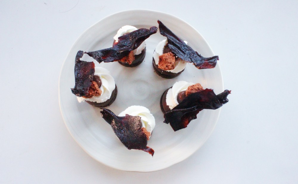This dessert literally only happened because I purchased a ton of cherries to make another recipe with, and I had to figure out what to do with them before they went moldy. Which is always a great motivator when you purchase way too much of an ingredient! So I went ahead and pureed my remaining cherries, and made a cherry gelee out of them. I figured I would use this gelee as a core for little mousse balls. But since I only needed a small amount of cherry gelee, I had a surplus of gelee that I had to get rid of. My solution? Dehydrate the heck out of it, and transform the extra gelee into this long, thin cherry veil/tuile things. I figured these long sheets of semi-translucent cherry puree would look gorgeous, but I wanted them to be crunchy, which, luckily enough, they were! Since I had the intentions of doing a cherry mousse sphere situation, I figured, why not default to the one cherry dessert that I grew up on? Aka black forest cake. I love doing takes on the black forest cake, because it was my birthday cake for the first 13 years of my life. So I wanted this to be my prettiest yet!