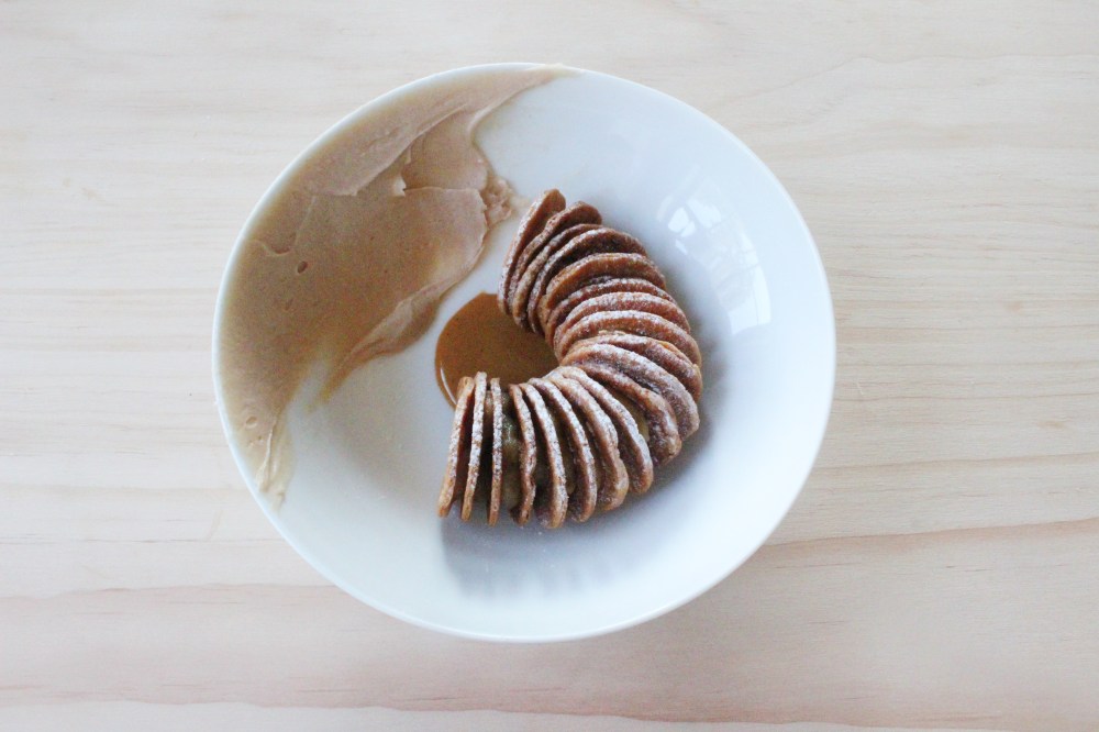 I created this dessert from just several techniques that I fell in love with, and wanting to compose those techniques into a cohesive dessert. Homemade phyllo is always something I love to do, while the usage of Almond Inspiration was just to add a pleasant nuttiness. I wanted to use hojicha as well, since it adds a toasty flavor that balances the Almond Inspiration nicely – think milk tea with almond cookies, that’s the flavor combination tastes like! Since it’s the fall, I went ahead with using apples, since they add a nice tartness that balance out the other flavors, and what better to pair with apples than gjetost cheese? For those unfamiliar, gjetost cheese is a Norwegian cheese made from slowly caramelized goat’s milk, so it’s similar to Oaxacan cajeta or dulce de leche!