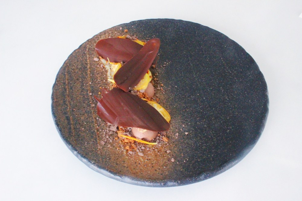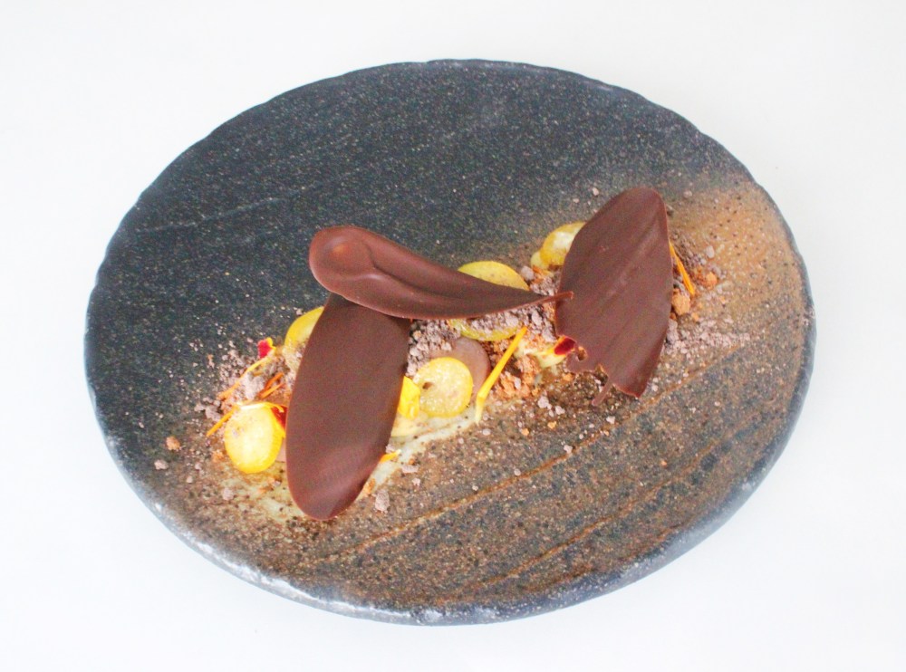As mentioned before, every component is vegan AND gluten-free. I wanted to use kumquats because I love the contrast of super tart fruit against bitter and rich chocolate. That and kumquats are an ingredient that I grew up on – there was a small kumquat bush that grew outside of my grandma’s old apartment in Taiwan, and they always fascinated me as a fruit because unlike an orange, these little orange-looking berries could be eaten as is, peel, rind, and all. I love how they are very tart on the inside, but the rind is quite sweet, making for a fun ingredient to add contrast to a dish. The usage of kinako(toasted soy bean flour) is to tie in with the tofu being used in the mousse, while I just love the combination of soy with chocolate in general as well! I also used the leftover water from the tofu packet in place of egg whites in the sable to further bind the dough together, since gluten-free doughs can use all the help that they can get. The beautiful thing about this crumble is that since essentially everything is cooked, you are really just looking for the sugars to caramelize around the lumps of kinako and almond/hazelnut flour to create a slightly crunchy and caramelized texture. I did list the options of either almond or hazelnut flour – I used almond flour since I had it readily available, but for any Nutella lovers out there, using the hazelnut flour will accomplish that sort of flavor profile for you. The chocolate “ash” was a fun component to make as well, since it is a great way to utilize anything leftover chocolate that was not used to temper the chocolate curl “feathers” with, while also adding another fun, contrasting element to the kinako crunch. Overall, this is a really fast and easy dessert to make, and one that embraces some of my favorite vegan and gluten-free things!