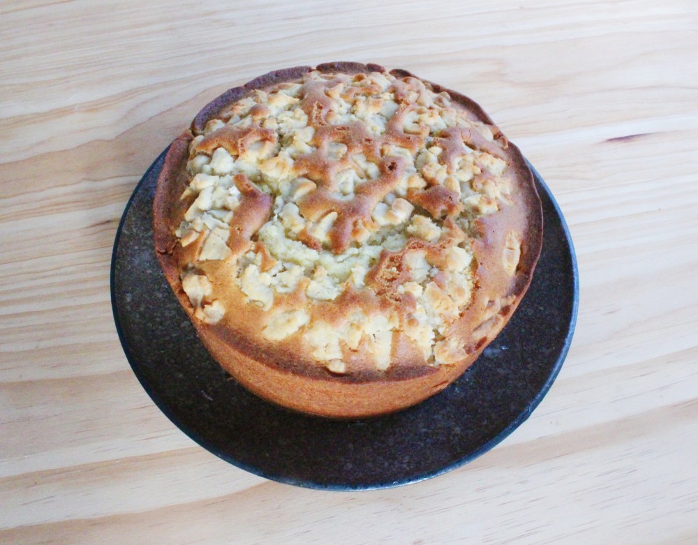In a lined 8-inch cake round, pour in half of the batter first. Sprinkle on half of your crumble, then pour on the rest of the batter, and the rest of the crumble. Bake at 350 degrees F for 55 minutes. Cool before unmolding.
