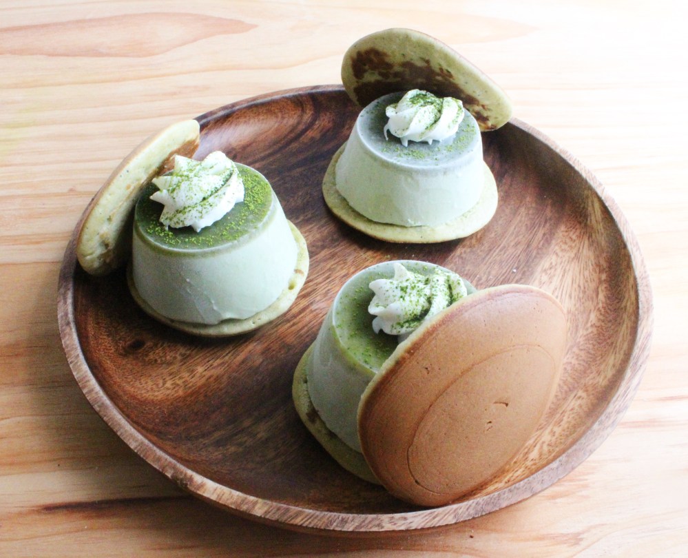 I have done dorayaki in the past, and I have even done purin-stuffed dorayaki as well, but this is a slightly different take on the usual. Typically, Japanese purin(also called pudding), is made of a baked custard topped with a layer of caramel, similar if not exactly the same as Mexican flan. However, my take on it replaces the caramel, which is already bitter, with a layer of matcha gelee. The matcha gelee resembles the caramel layer, while also accentuating the already present matcha in the matcha purin itself, as well as the matcha in the pancake portion of the dorayaki! With this dessert, you’re really left with a lot of matcha, so it really is a green tea-lover’s delight!