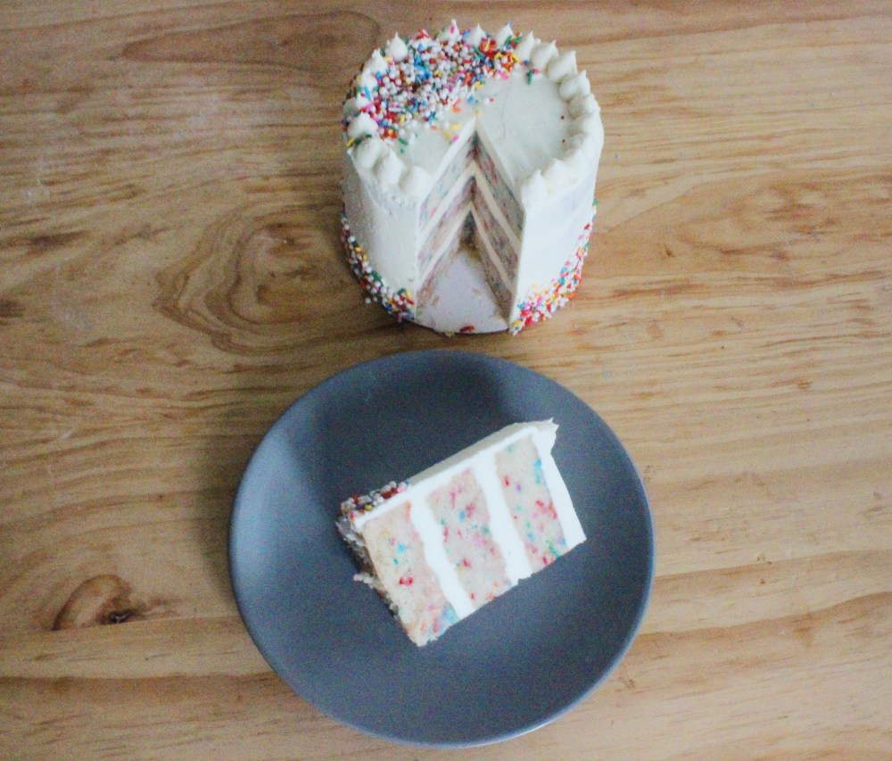 Line a 6-inch ring mold with acetate. Place down the scrap layer of your cake rounds. Then pour onto that 1/3 of your soak. Spread on about 1/3 cup of the buttercream. Then repeat those steps with the rest of your remaining cake rounds, making sure that the top layer of buttercream is a smooth layer. Freeze for at least 2 hours before unmolding. Once unmolded, spread more buttercream around the sides of the cake to cover it, using an offset spatula or a bench scraper to create straighter edges. Pipe the rest of the buttercream on top of the cake as a border. Finish the cake with rainbow sprinkles.