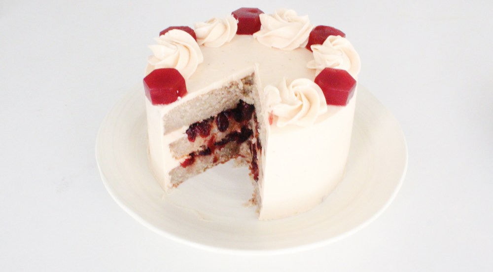 The entire cake was quite fun to make, just because it was straight-forward flavor-wise: everything is either yuzu, cranberry, or both. The exterior contrasts the interior hilariously well, as you would assume the cake to be really simple and basic, almost Mary Sue-like if you will. Then you cut into it and see the cranberry compote inside, which kind of looks like you just cut into a body. I wish it did not look that way, but unfortunately it just does thanks to the compote just dripping out like entrails and blood. Whoops. Probably should not have given that visual, but at the same time, I know I’m not lying here. I’ll just say this cake works as well with Christmas or Thanksgiving as it does with Halloween, since it totally does: