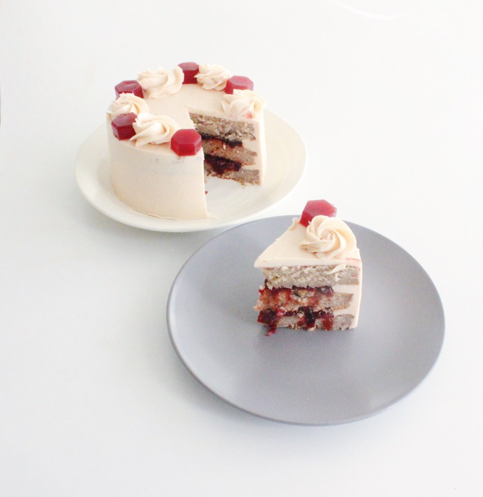 On either an icing table or a transferrable surface, start with a small border of buttercream around the edges of your scrappy layer of cake. Fill in the rest of that layer with half the compote. Place on the next cake layer and repeat. Then place on the last cake layer. Using about 1/2 of your buttercream, spread around the cake to form your crumb coat. Freeze for 20-30 minutes. Then spread on about 2/3 of your remaining buttercream around the cake using an offset spatula and bench scraper to form a smooth surface. Pipe on the remaining buttercream on top and garnish with the gelees to finish.