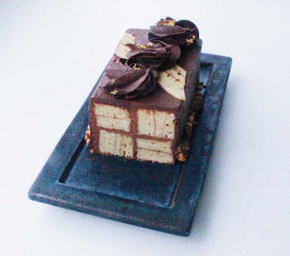 For my baumkuchen, we have an almond or hazelnut(depending on which flour you use) genoise, or spongecake, as the base for the batter. Almond or marizpan is typically used in baumkuchen, so I wanted to stick closely to that tradition. We are brushing the cake with a soaking liquid, just since it can go dry, and assembling the cake in a similar fashion to a battenberg cake(square checkerboard cake). This requires a little bit of trimming on the cake, just to guarantee that the shapes of the baumkuchen are symmetrical, but those trimmed pieces are a great little snack while you’re assembling the finished cake anyways! The exterior will be covered in a whipped nama chocolate(a fudgy ganache usually used in Japanese truffles) that is infused with either hazelnut or almond liquor, and coated with crushed almonds or hazelnuts, and finished with gold leaf for that fancy touch. While this is by no means a bouche de noel or yule log, this is still a cake that is festive, reminiscent of a tree, and still fun to cut into, just to see all of the layers that you would have worked so hard to create!