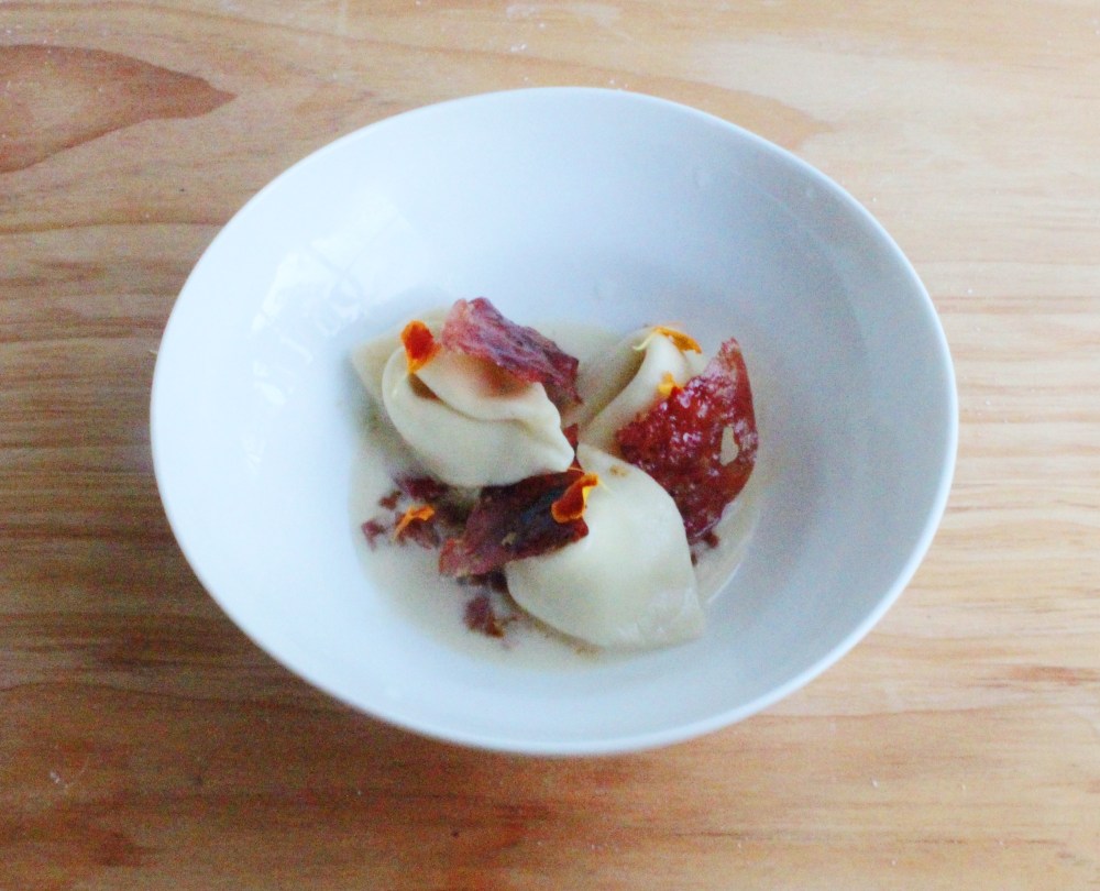 This dish was inspired by a Hong Kong breakfast classic, being macaroni soup. Macaroni soup consists of a creamy chicken stock, macaroni noodles, and ham. It is a Cantonese breakfast staple, and I found it to be the perfect inspiration for a fun dish! For my take on a macaroni soup, I went with a creamy chicken veloute, which is a French sauce made with stock thickened with a roux(I used chicken fat in the roux, just to give the final product a more cream of chicken-like consistency and flavor). For the pasta, I made sopressini, which is a shape that is quite similar in to fortune cookies(I figured that this was appropriate in that fortune cookies are seemingly Asian but actually Californian, and that’s 100% me as well). I also, just to make this recipe extremely confusing, went with sopressata(Italian salami) for my ham element. I used the sopressata to make an XO sauce, a popular condiment from Hong Kong that brings a punch of umami from both ham and dried seafood, and candied some on top for some crunch as well. I dubbed this dish “Lazy mornings”, as it was a nod to this dish being inspired by breakfast.