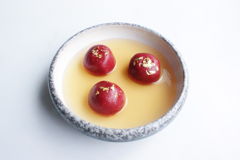 Place the tangyuan in a bowl with the syrup and goji berries. Garnish with gold leaf to finish.