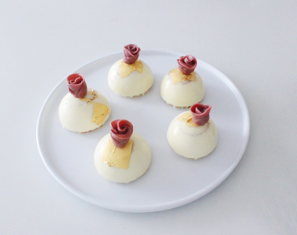 This is my petit gateau(mini cake) take on the Swedish Prinsesstarta(Princess Cake). The Princess Cake usually consists of layers of vanilla cake with a vanilla custard/pastry cream and a raspberry jam, finished with fondant and/or marizpan. Now I could do fondant or marzipan, but those just don’t really taste good to me, nor do I really have an interest in fiddling around with them. So for the exterior, I went with a mirror glaze and homemade modeling chocolate, since both are made of white chocolate, and in my eyes, both taste a lot better than gum paste would. I will be honest in admitting that I would sooner die than cover my desserts in fondant. Fondant is hard to work with, just tastes like straight up sugar, and honestly is not worth the amount of effort it tastes to color, roll, and shape it. For this cake, rather than dealing with that, I found that a mirror glaze would give a similar, if not actually nicer sheen to it, while being a lot easier to execute. And since the cakes are normally topped with a mazipan or fondant flower of some kind, just to humor that halfway, I went with modeling chocolate, which is super easy to make actually, and honestly tastes better to me than fondant would have anyways.