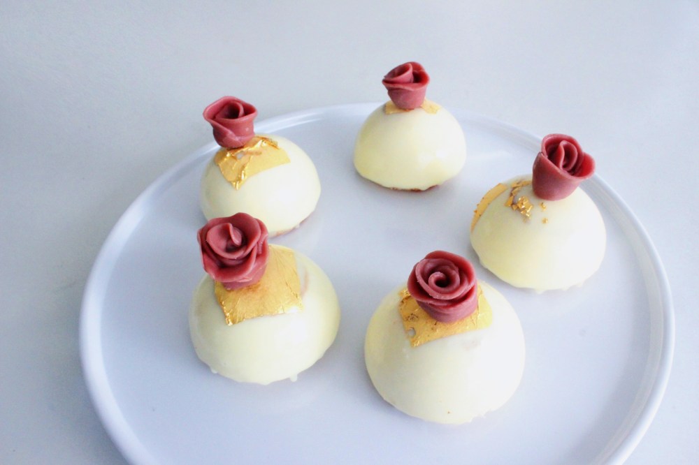 Place your still-frozen cakes on a small elevated surface. Pour the glaze over each cake and allow that to set before transferring your cake to your intended serving vessel. Garnish with edible pearls and the modeling chocolate flowers to finish.