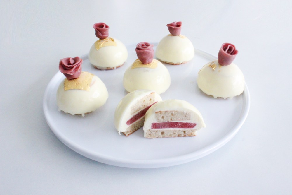 For the different layers, we have a vanilla chiffon cake, a vanilla mousse, raspberry gelee, coated in a white mirror glaze, topped with homemade modeling chocolate, and edible pearl sprinkles. I wanted this to be a really light and airy take on the Princess Cake, using a Bavarian/diplomat cream in place of the pastry cream, and using a chiffon cake for my sponge, since the egg white-leavened batter has the consistency of a cloud. The raspberry gelee is completely unsweetened, just to guarantee that the sweetness from the modeling chocolate and mirror glaze do not completely overwhelm the rest of the dessert. The idea to do a mirror glaze came to me when I saw videos of assembling Princess Cakes, and how they usually dome off the tops of the cakes with cream before using the fondant. For me, I figured half dome sphere molds would make that process easier, and I usually finish off cakes I set in sphere molds with mirror glaze, so that just made sense to do. The modeling chocolate was a technique my friend Bethany taught me back in college, and it is still one that I use to this day when I need to do cake decorations in place of fondant(this one goes out to you, Bethany!). I opted to use ruby chocolate for this, since it was naturally pink to begin with, but Raspberry Inspiration or white chocolate mixed with pitaya powder or pink gel food coloring are accessible substitutions as well(for optimal flavor, I would say to use the Raspberry Inspiration, but I find that the ruby chocolate gives the best appearance and it has tartness that makes it a close second in flavor to the Raspberry Inspiration!).