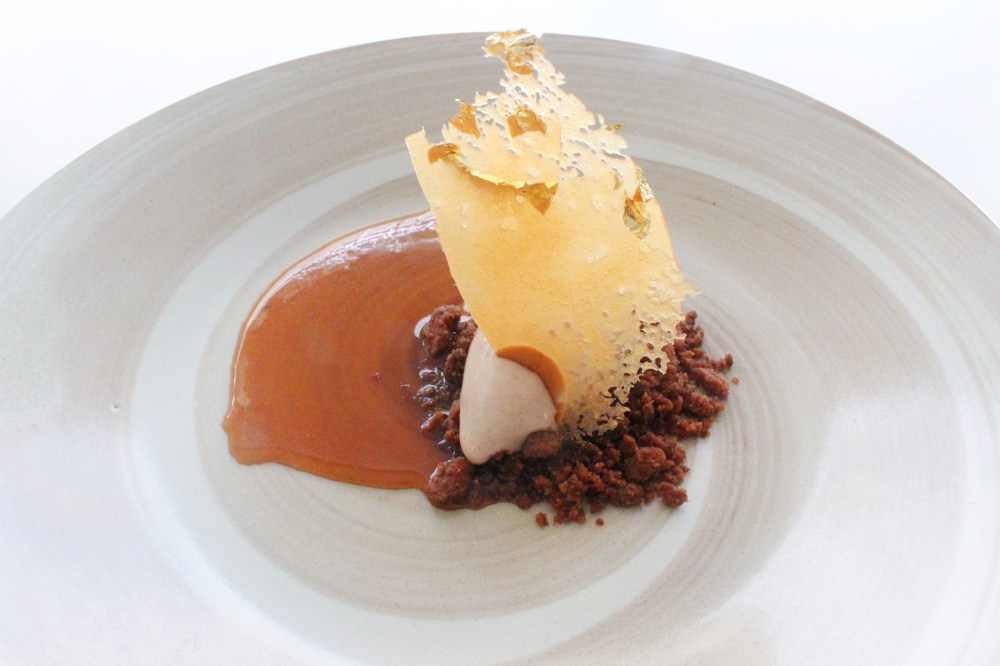 Start with two tablespoons of the crunch on the bottom. Place on top of that either a quenelle or scoop of the ice cream. On the side, do a large circle of the butterscotch. Finish the top of the ice cream with shards of the Ritz lace and optionally, gold leaf.