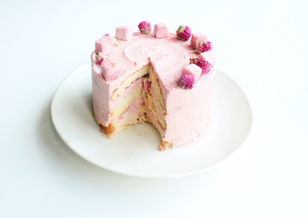 Start with 1 round of cake first. Add on the soak, then 1/4 of the buttercream, and 1/3 of your Turkish delight. Repeat for the next layer. For the 3rd layer, start with soak and buttercream. Then spread the remaining buttercream around the sides of your cake in an even layer(I recommend a cake turntable and a bench scraper). Freeze the cake so that you can transfer it to the desired serving surface. Then dust with the pink sugar, and garnish the top with Turkish delight cubes and the amaranth flowers to finish.
