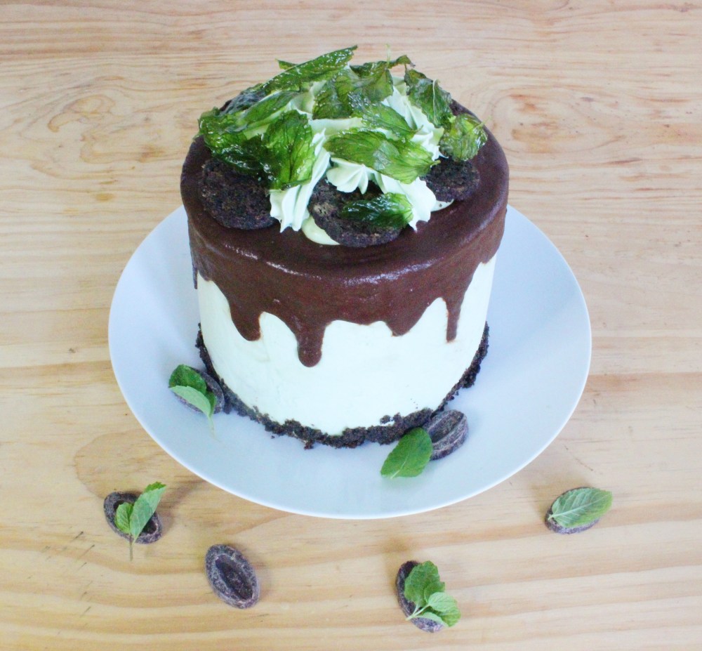 Start with a 6-inch cake round or a plate larger than 6-inches, and a 6-inch ring mold. Place down the scrap layer of cake first, then pour in 1/3 of your cake soak. Remove the ring mold at this point. Pipe a border around the layer of cake with the reserved 1/4 of the frosting. Pour in 1/2 of the white chocolate and mint pastry cream, then sprinkle in 1/2 of the crushed cookies. Repeat these with the second layer. For the top layer, just add on the soak. Spread 1/4 of the remaining buttercream around the cake first to act as a crumb coat. Freeze the cake for at least another hour before attempting the next part.