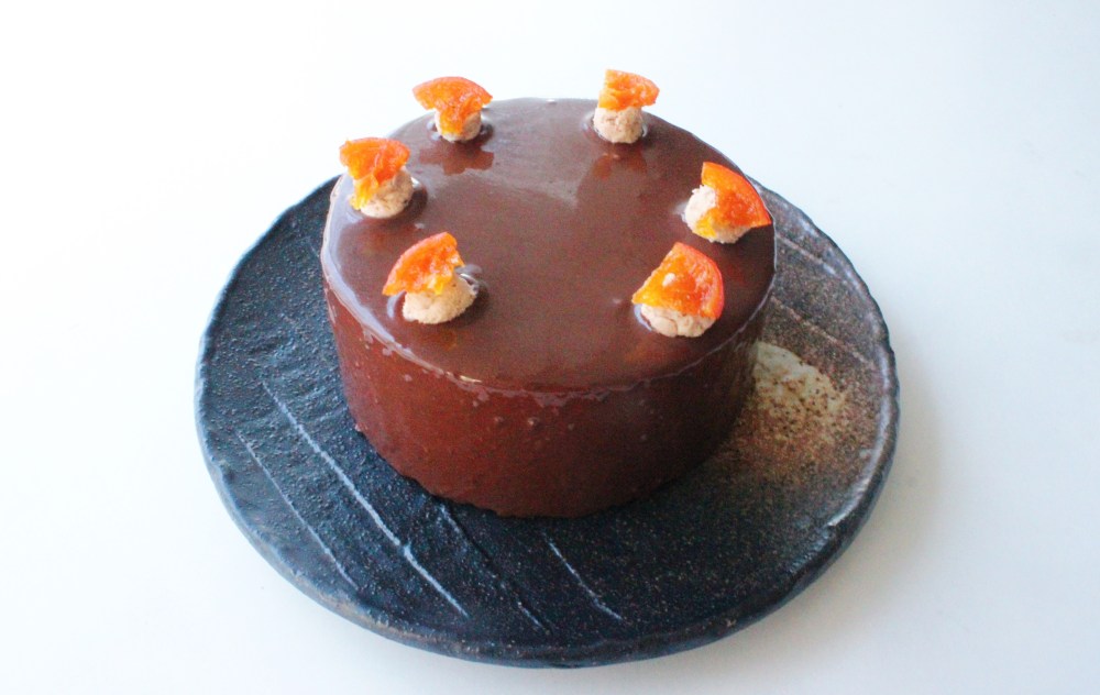 Mix the gelatin into the tangerine juice. Heat up the gelatin mixture with the zest, milk, and salt. Once the mixture is boiling, add in the dark chocolate. Let the mixture cook on low heat for 1 minute before taking off heat and stirring until combined. Pour through a sieve to remove any lumps and the tangerine zest. Allow the glaze to cool down to 90 degrees F before attempting to use on the cake. To glaze, place the frozen cake on an elevated surface(I use an upside down deli cup on a sheet tray to catch the spare glaze). Pour the glaze onto the cake and allow it to set at room temperature for at least 2 minutes before transferring to the freezer.