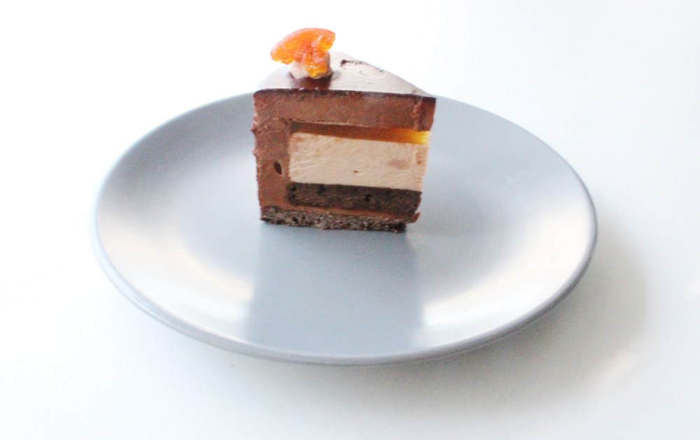 In the 6-inch ring mold with the shortbread base, place down 1 tbsp of the dark chocolate mousse first, spreading it into an even-ish layer(you just need enough to act as a glue between the cake and the shortbread!). Press onto the dark chocolate mousse layer your chocolate cake then place on top of that the milk chocolate mousse and the gelee, keeping them 1/2 an inch away from the edges, centered in the middle of the shortbread. Pour in the rest of the dark chocolate mousse. Transfer to the freezer and freeze solid, about 4 hours, before attempting to unmold.