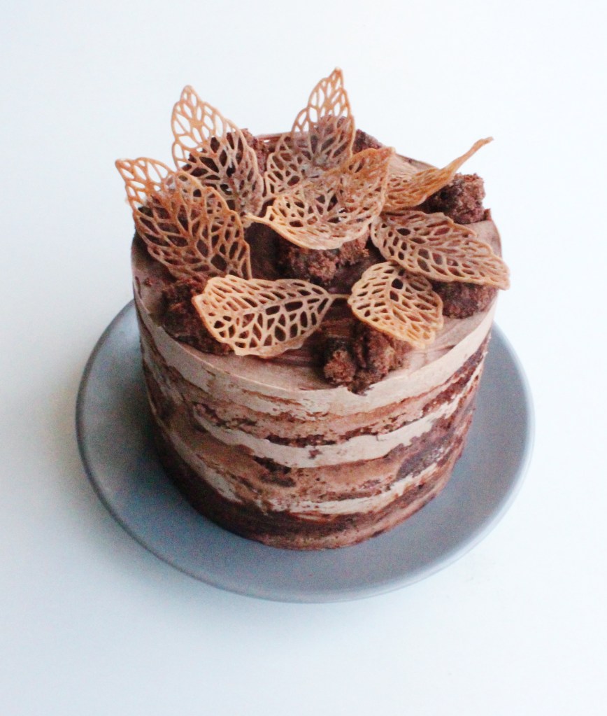 This cake is basically a chocolate and coffee lover’s dream. Layers of dark chocolate cake with an Ovaltine latte soak, whipped chocolate ganache, a chocolate cookie crumb, cocoa-coffee French buttercream, and coffee tuiles. With each layer, I wanted to make sure they all brought different forms or textures of chocolate or coffee. We have the whipped ganache for a mousse-like texture, a fudgey dark chocolate cake that is soaked with the Ovaltine and coffee to bring out the rich, bitter cocoa notes, a silky coffee French buttercream, crunchy dark chocolate chip cookie pieces, and espresso tuiles to add a nice finish on top!