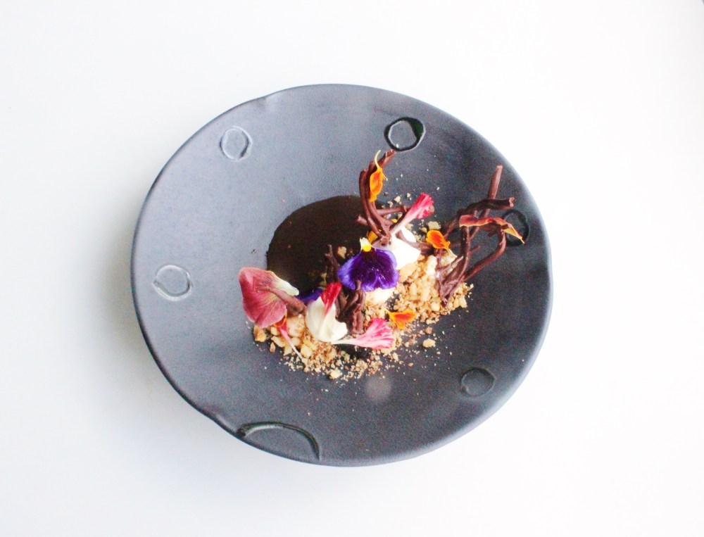 For this rendition, I started with a rectangle of the cake first. Then I piped on top of that the mascarpone and garnished with a sprinkle of the crumble. Garnish the top of the mascarpone and crumble with the twigs and flower petals. Finish with a pour of the sauce on the side.