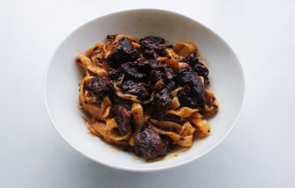 Cook off the ground beef and salt in a pan with the salsa macha on low heat until cooked through and dark brown in color. I actually used cubed pieces of steak for mine, but I found that the texture of ground meat plays off the salsa better! Toss the noodles through the still warm salsa to finish.