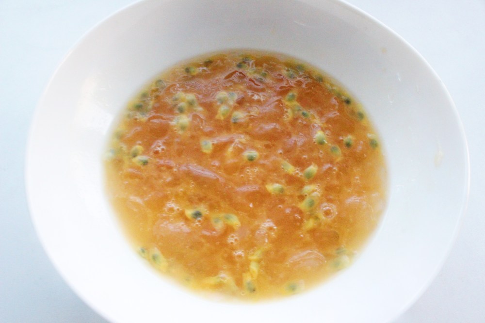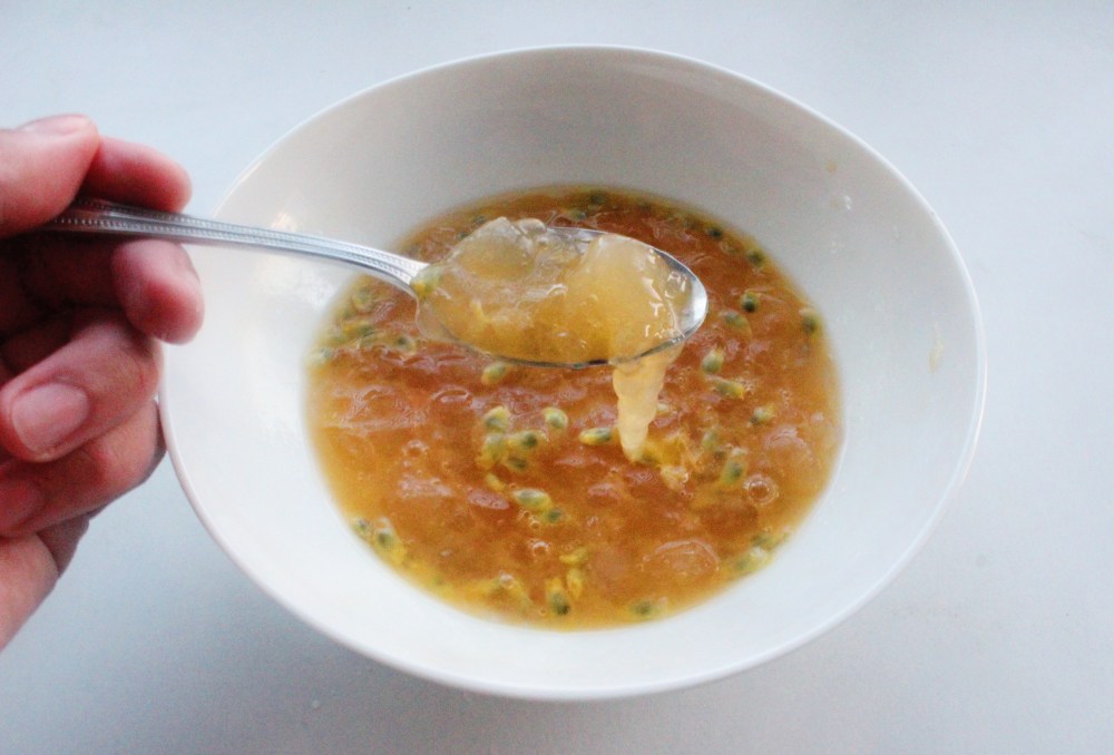 I was inspired by Taiwanese grass jelly when making this dessert. Grass jelly is an Asian dessert that consists of these dark brown cubes of jelly that are flavored with mesona chinensis leaves(the jelly basically tastes like a pleasant black tea with grassier notes). Usually grass jelly is topped with sweet braised peanuts and tang yuan(poached mochi), giving it this hearty yet refreshing feel. I loved the idea of taking this dessert and making it more bright and summery, using passionfruit. Now I’m sure some of you are wondering what “POG” is? POG is a Hawaiian juice that consists of passionfruit, orange, and guava. It was really delicious, and a lot of Japanese grocery stores actually sell it! You can use just passionfruit juice for this dessert if you want to, but I like the variety that POG adds, as the orange and guava provide sweetness and a pleasant zestiness to the jelly.